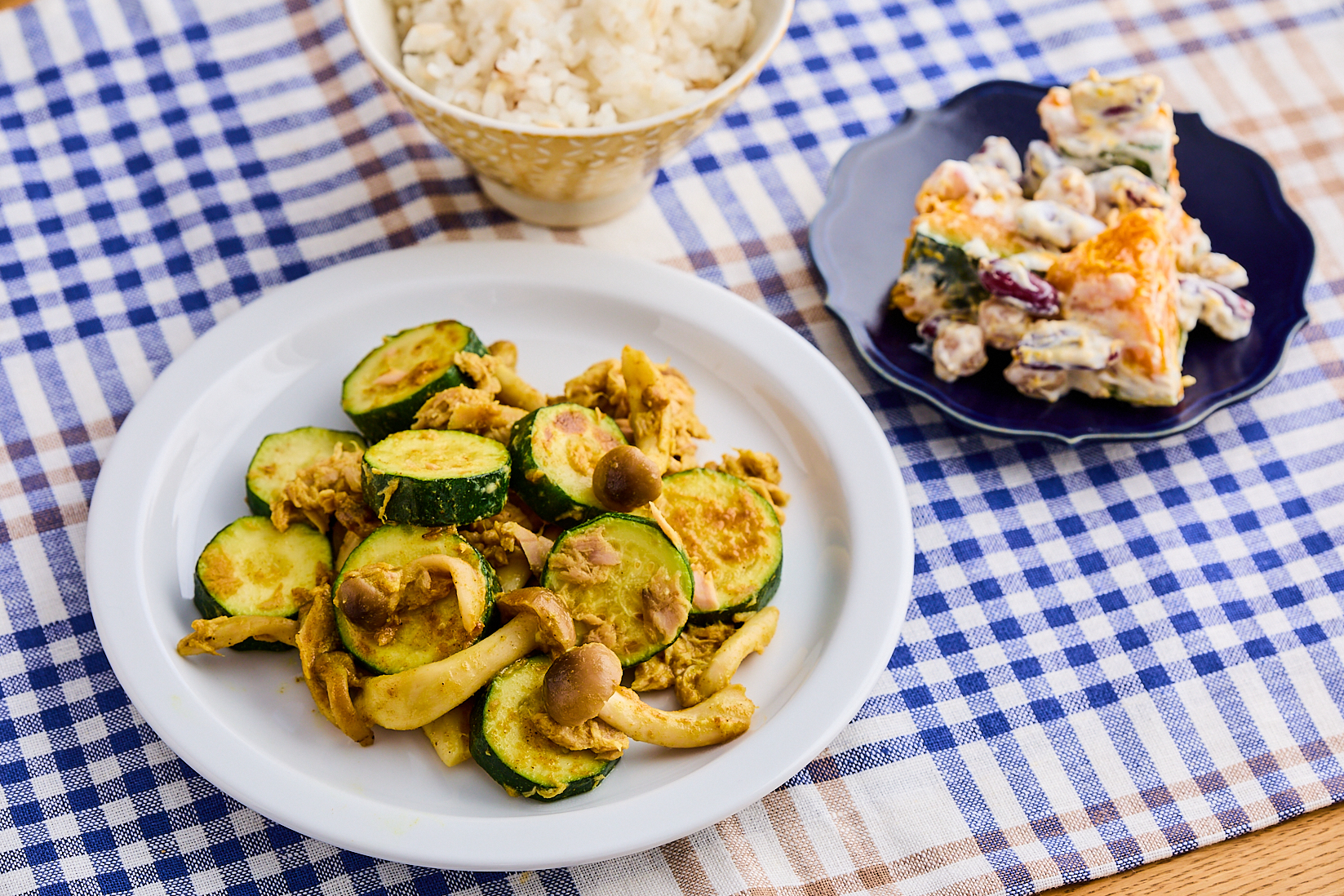 ズッキーニとツナのカレー炒めが主菜の献立です。スパイシーな風味が食欲をそそり、暑い夏にぴったり。副菜には、ほんのり甘くてさっぱりとした、かぼちゃとビーンズのヨーグルトサラダを合わせました。サラダから作り、冷蔵庫で冷やしている間にカレー炒めを作るのがおすすめです。