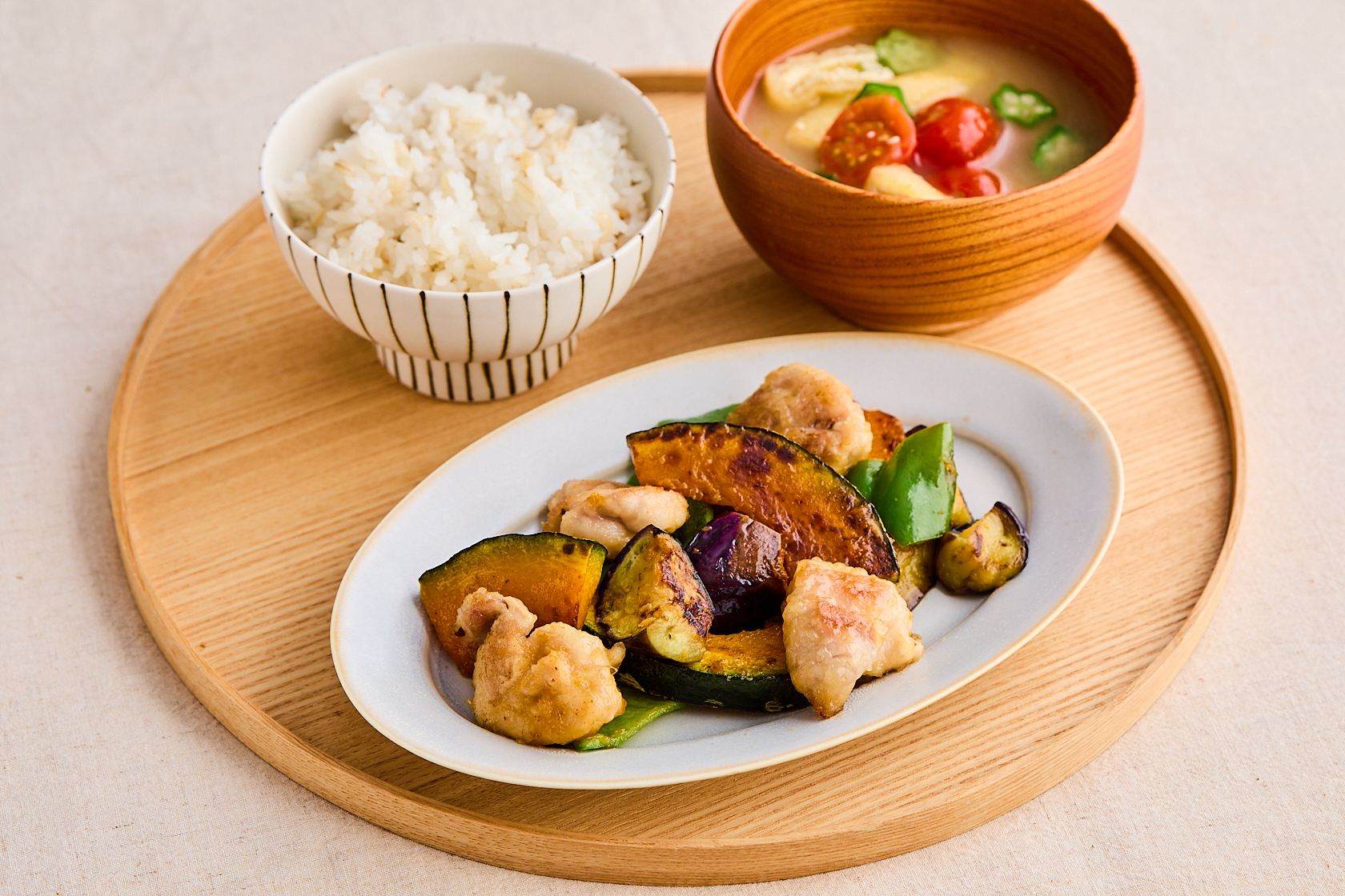 鶏肉と夏野菜のさっぱり炒め・ミニトマトとオクラのみそ汁・麦ご飯(押麦・150g)