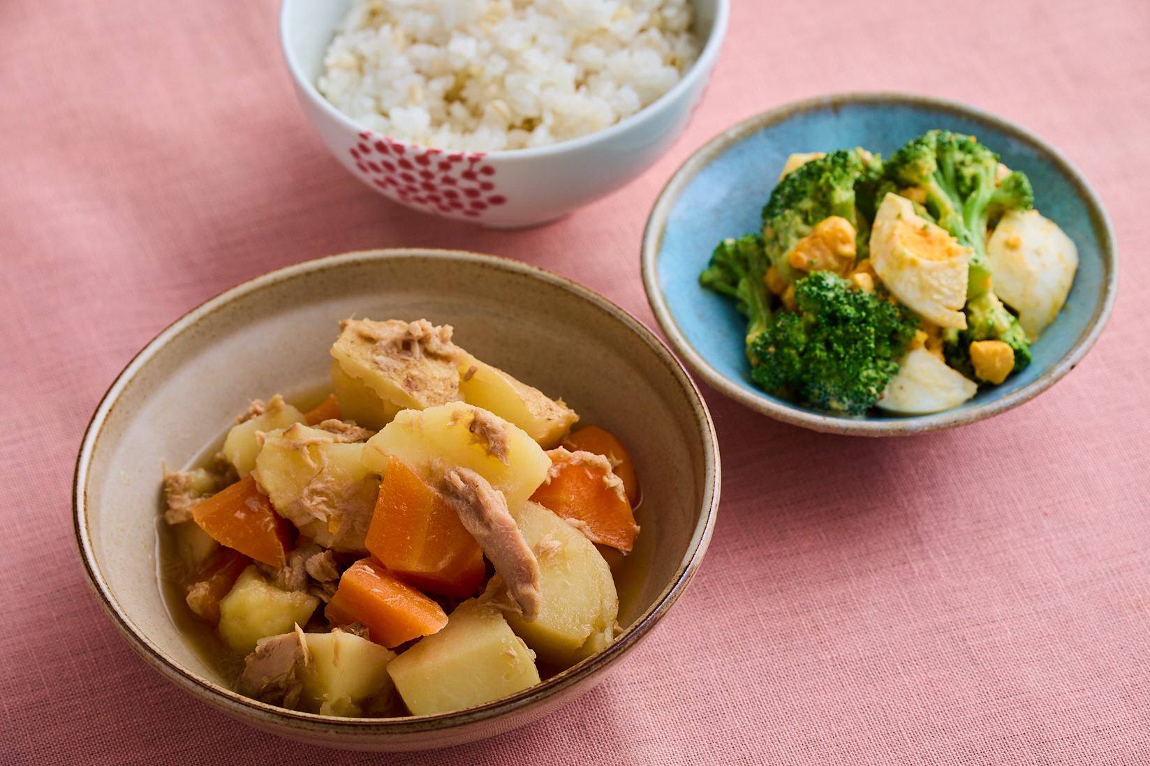 日曜日 ツナと新じゃがのお手軽春おかず献立 ツナじゃが・ブロッコリーと卵のごまマヨあえ・麦ご飯(押麦3割・150g) の管理栄養士から ツナ缶は下処理いらずの時短食材。肉じゃがの肉をツナに替えるだけで、手軽にたんぱく質が補えます。旬の新じゃがは皮が薄く、皮ごと使うことができるのが嬉しいポイント。むく手間を省きつつ、風味をプラス。ツナじゃがを煮こんでいる間に副菜を仕上げるとスムーズです。