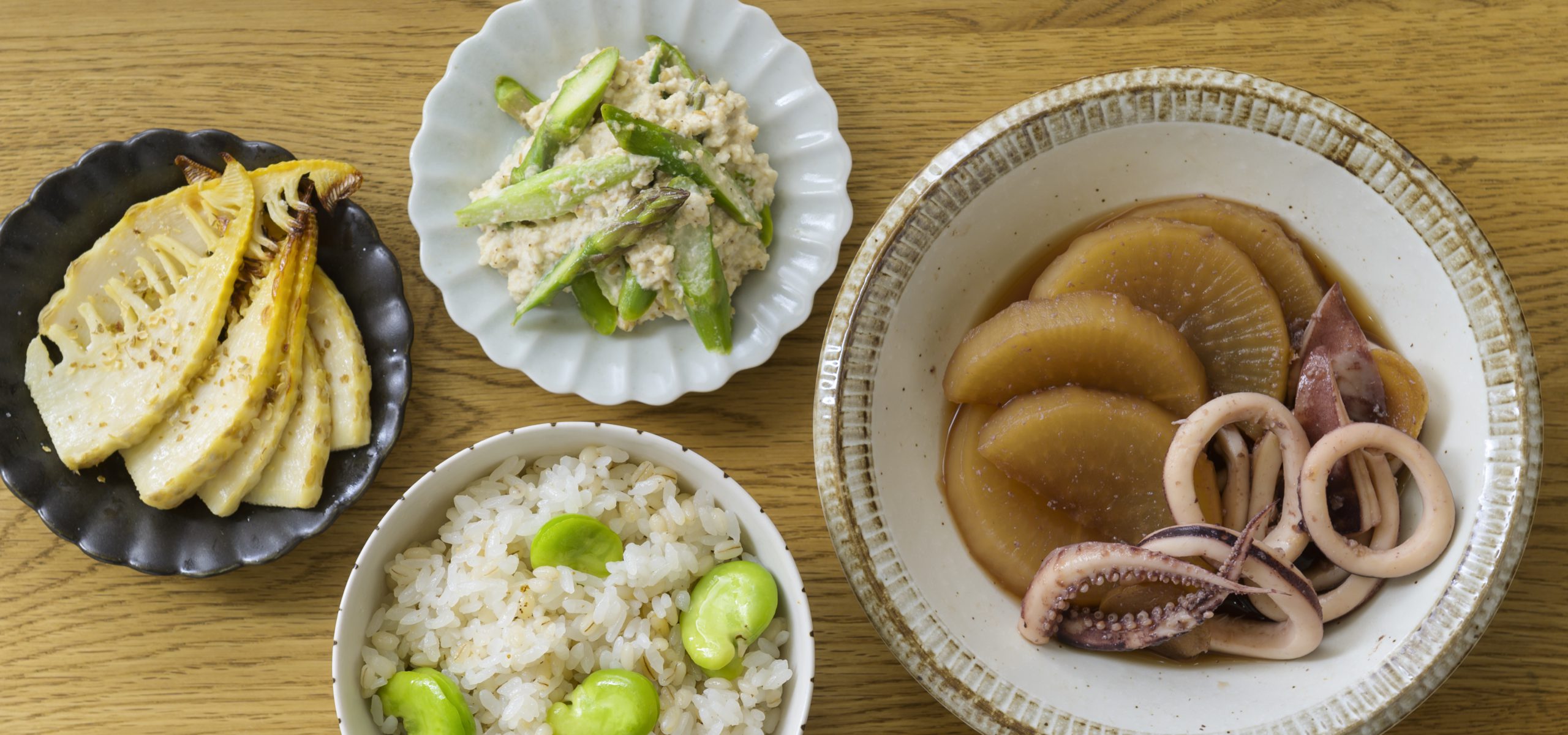 そら豆ご飯・いか大根・たけのこの山椒焼き・アスパラガスの白あえ