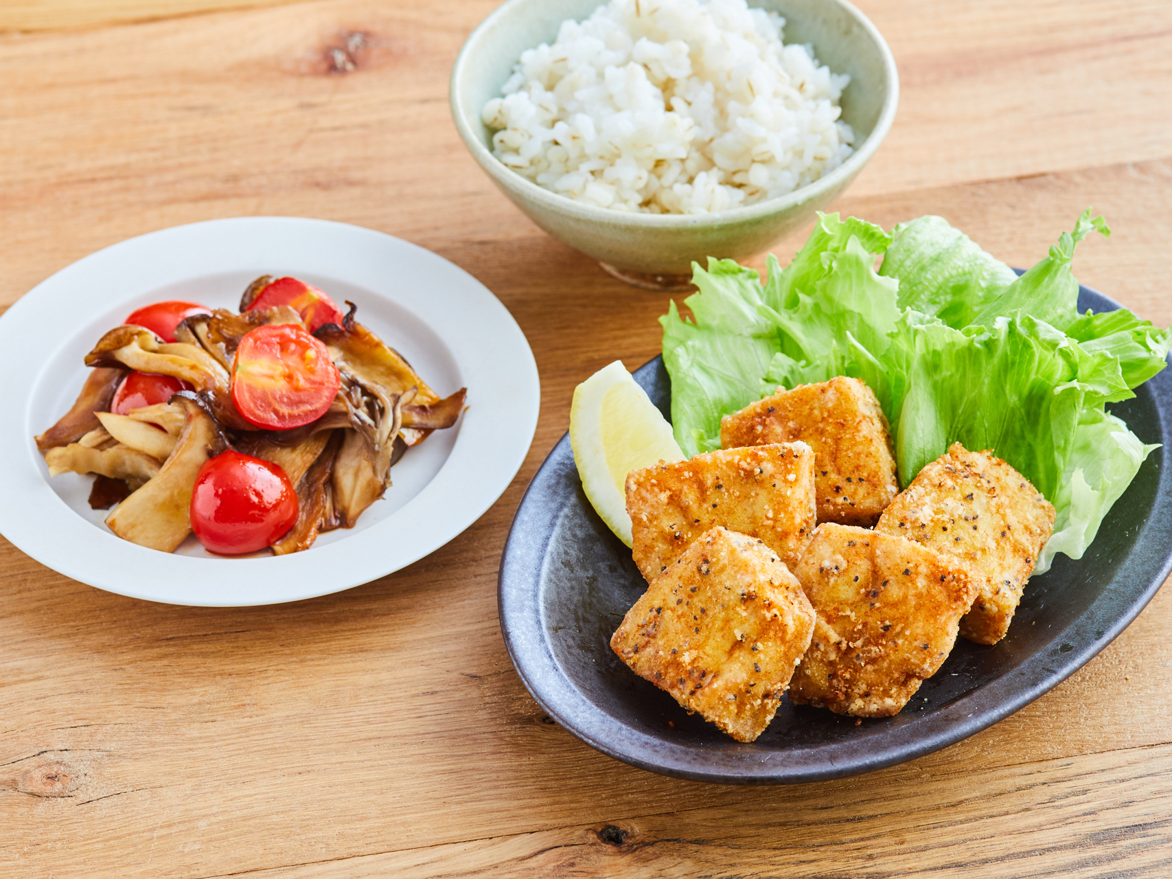 かじきのスパイシー揚げ・きのことトマトのマリネサラダ・麦ご飯(押麦2割・150g)